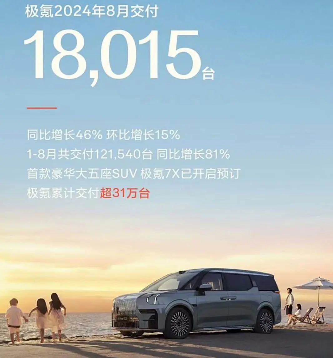 日前,极氪官方公布了其2024年8月共交付18015台新车,同比增长46%,环比增长15%。1-8月共交付121540台,同比增长81%,极氪已累计交付超31万台新车。