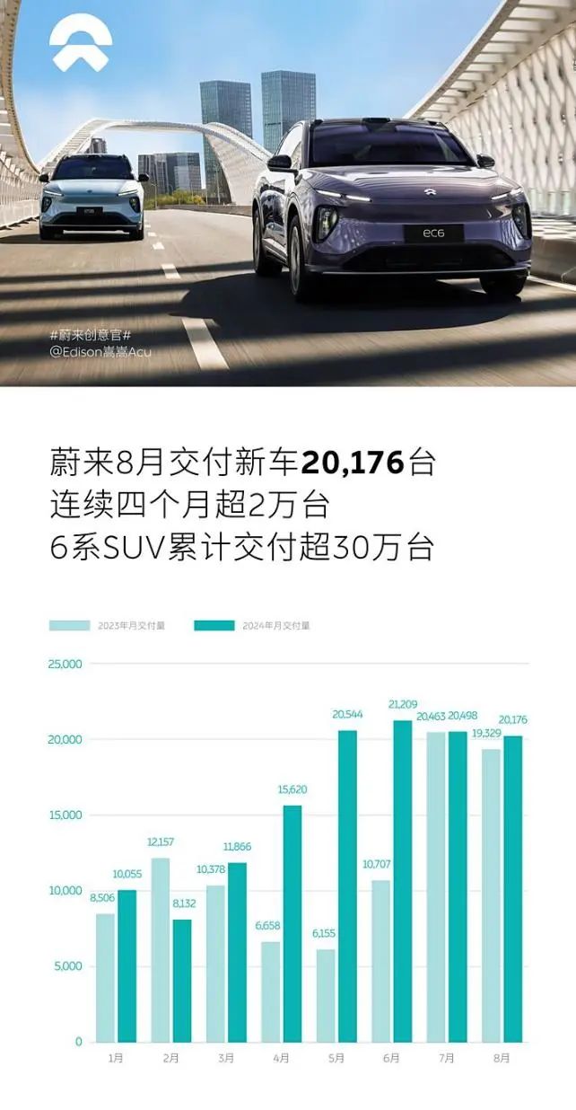 2024年8月,蔚来交付新车20176台,连续4个月超2万。今年1-8月,蔚来共交付新车128100台,同比增长35.77%。截至目前,蔚来已累计交付新车577694台。