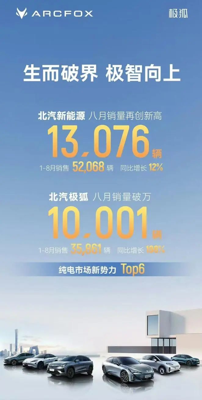 近日,极狐汽车公布了2024年8月的销量数据。极狐8月销量为10001辆,1-8月销量为35861辆,同比增长198%。