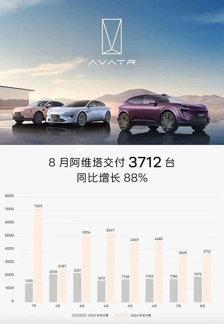 日前,阿维塔公布8月交付数据,共计交付新车3712台,同比增长88%。