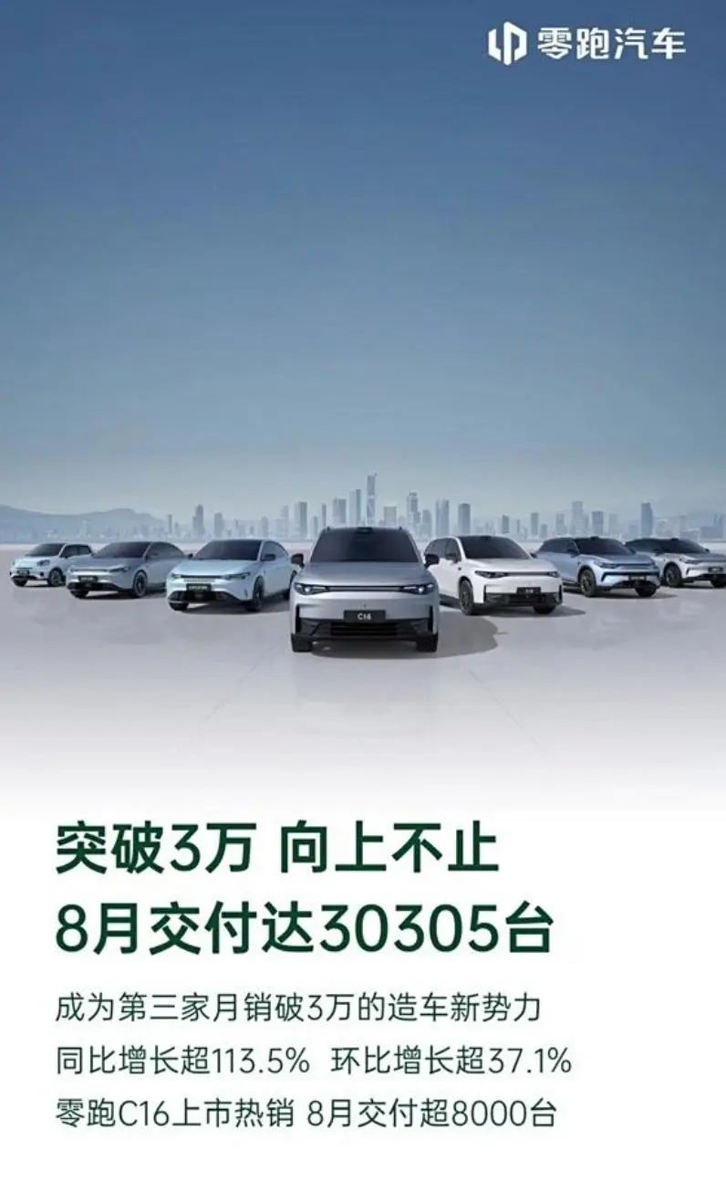 日前,零跑汽车公布了其8月交付量为30305台,同比增长超113.5%,环比增长超37.1%,零跑C16 8月交付超8000台。