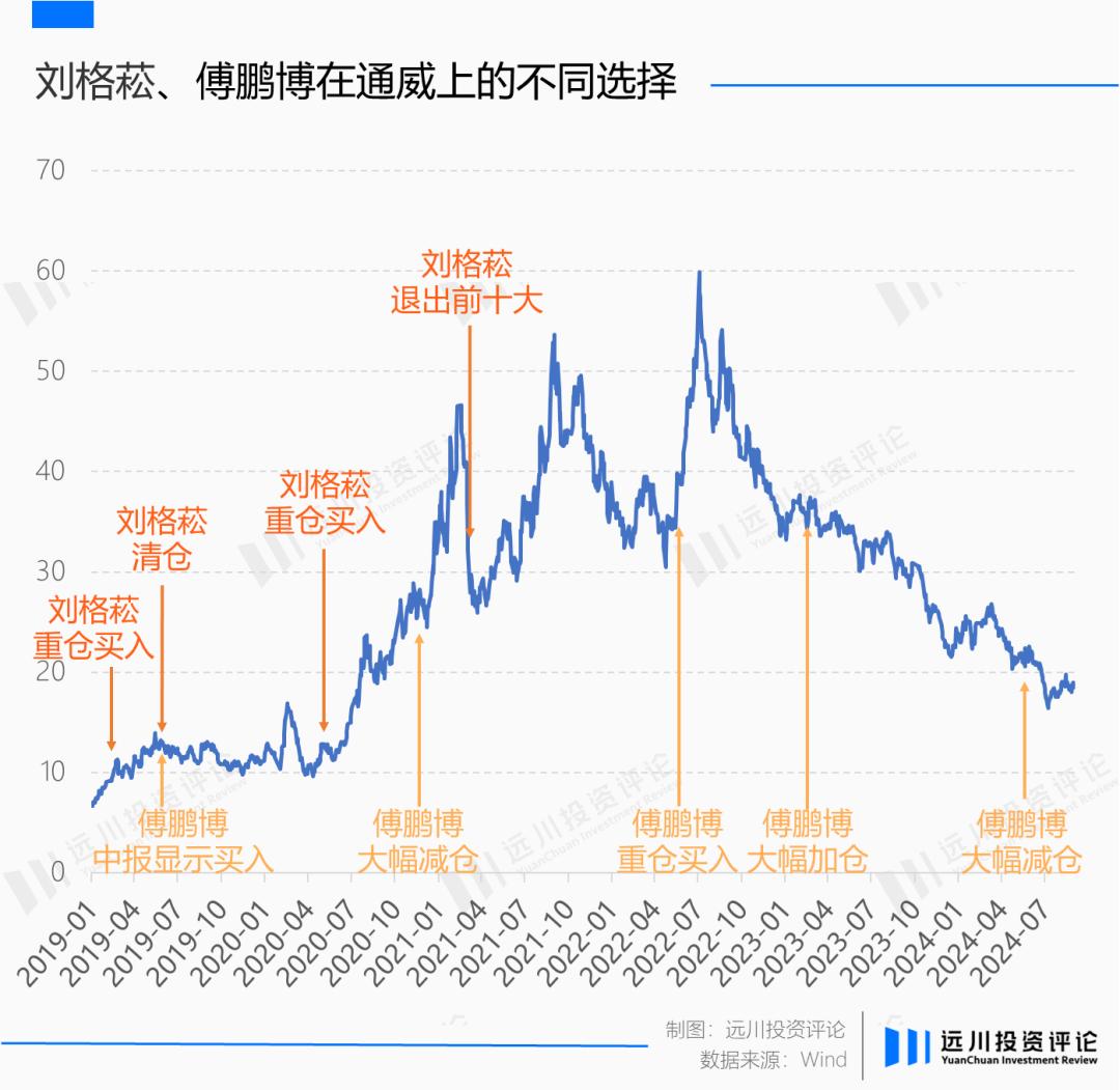 只不过整个行业利润直接转负超出了多数人的预期。自2022年二季度买入通威,傅鹏博在后来下跌过程中加仓至翻倍,直到今年上半年傅老师大笔减持近3200万股通威,退出前十大股东——此时的通威距离最高点,已经跌去了三分之二。
