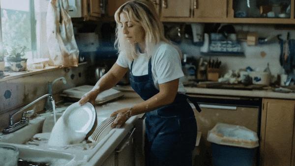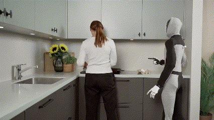 而曾经的女主人则系着围裙,站在洗碗池旁,洗着成堆的碗碟。同时,还得应付 NEO 的「发号施令」: