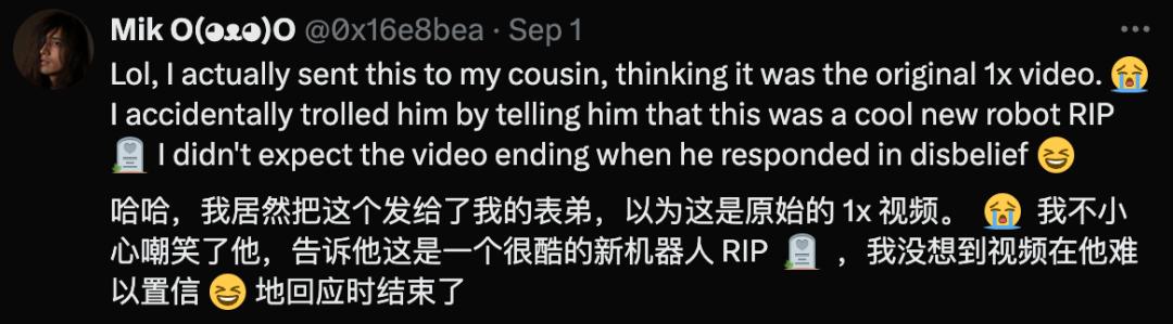 网友 Mik 一度以为这是 1x 发布 NEO 的原始视频,就顺手转发给了他表弟,却「收获」一顿嘲讽: