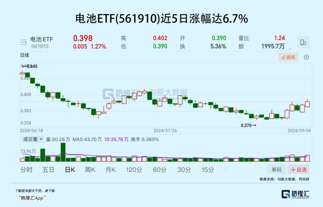 电池ETF(561910) 从8月29日开始上涨,近5日涨幅达6.7%,领涨ETF市场,位居同类ETF涨幅第一。