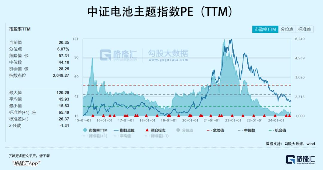 首先,这两个板块同属新能源,经过长时间的估值消化,目前都处在底部区间 ,如中证电池主题指数PE(TTM)最新值为20.35,处于近十年6.07%分位点。
