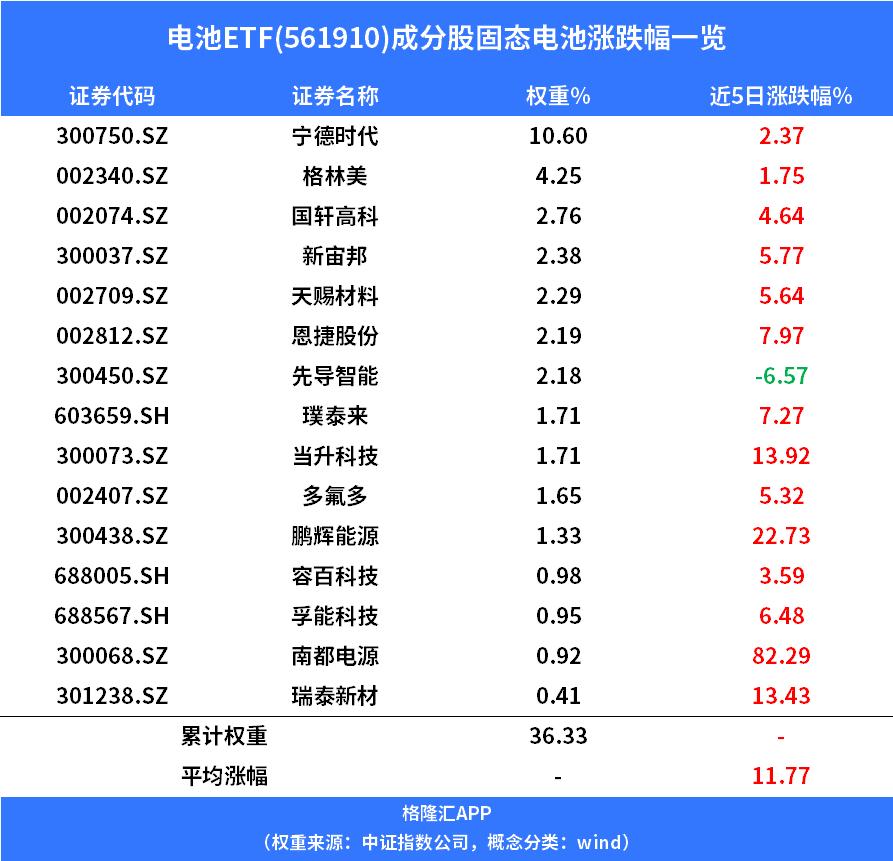 值得注意的是,电池ETF(561910)成分股中有15只固态电池,权重占比36.33%,包括近5日涨超80%的南都电池、近5日涨超22%的鹏辉能源。