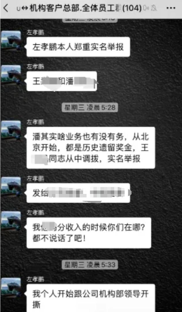 据相关群聊截图,上述言论最早发布时间是某天的凌晨4点,随后的几个小时之内持续发布,一直持续到上午9点之后。而这100多人的工作群内,曾有人就考核结果向左孝鹏作出解释,“左老师,上周五和你解释过,考评A或B完全是根据客观业绩指标完(成情况)。”不过,左孝鹏表示不接受解释,要求把业绩亮出来看看到底怎么回事。