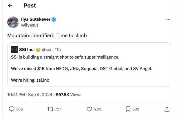 OpenAI 联合创始人 Ilya Sutskever 的新公司筹集了 10 亿美元,并宣布计划组建一支由“世界上最优秀的工程师和研究人员”组成的团队,专注于一项单一任务。