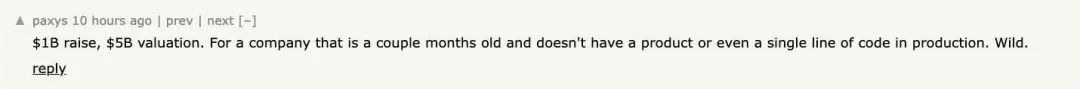 “融资 10 亿美元,估值 50 亿美元。对于一家成立几个月、没有产品、甚至没有一行代码投入生产的公司来说,这太疯狂了。”