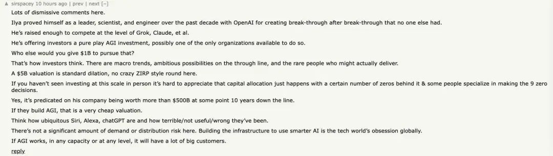 这里有很多轻蔑的评论。Ilya 在过去十年中通过在 OpenAI 的出色表现,证明了自己作为领导者、科学家和工程师的能力,连续实现了其他人无法企及的突破。他已经筹集了足够的资金,能够与 Grok、Claude 等顶级企业竞争。他为投资者提供了一个纯粹的 AGI(通用人工智能)投资机会,可能是少数能够做到这一点的组织之一。你还会把 10 亿美元交给谁来追求这一目标呢?这就是投资者的思维方式:宏观趋势、雄心勃勃的可能性,以及少数真正有可能实现这些目标的人。