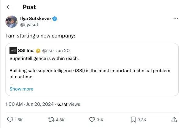 “SSI 是我们的使命、我们的名字和我们的整个产品路线图,因为它是我们的唯一重点。我们的团队、投资者和商业模式都与实现 SSI 统一。”
