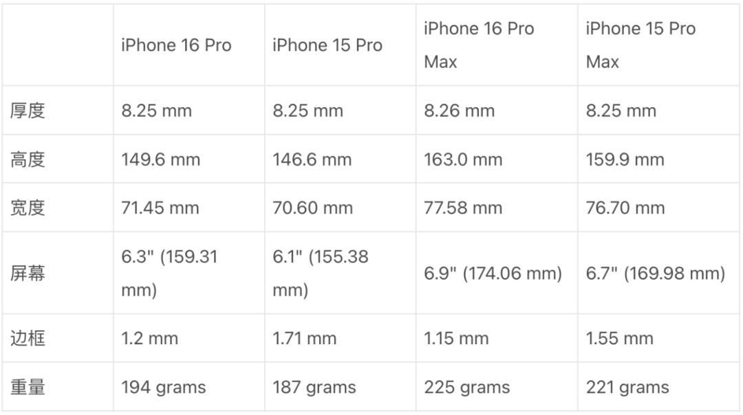 如果你对 iPhone 16 的详细尺寸和重量感兴趣,MacRumors 甚至已经准备了一份表格,上面清晰地展示了 iPhone 16 Pro 系列和上一代的对比情况。