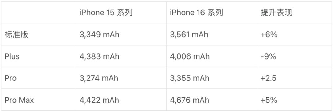 续航方面,根据 RGcloudS 的爆料,Apple 将在 iPhone 16 系列上采用堆叠电池技术,可以显著提升电池的容量和寿命,与此同时还将支持 40W 有线充电功率和 20W MagSafe 无线充电功率。具体的电池参数可以参照 MacRumors 制作的下表: