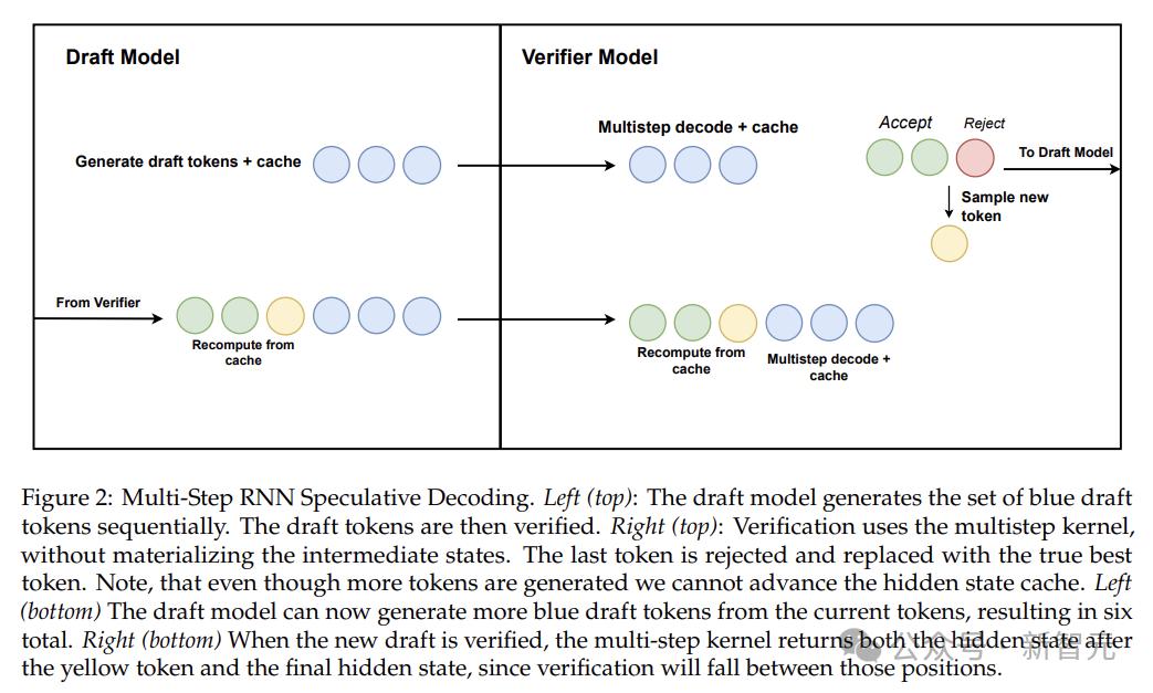 对于验证模型,首先从缓存中重新计算之前的步骤,然后对新的草稿token序列进行多步解码,最后在单个内核中进行缓存。