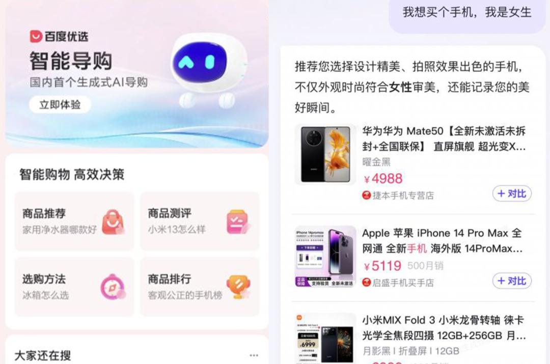 具体来说,在用户端,百度APP内置了对话式个人导购助手,名为“小优”。用户需通过搜索特定关键词(如“智能导购”)来激活此功能。小优随后以问答形式与用户互动,基于用户的输入提供产品推荐,辅助用户进行购物决策——这条链路的优势在于,百度可以通过用户的搜索习惯,更精准地摸索到用户的消费需求,并通过大数据训练提升商品推荐的精准度。