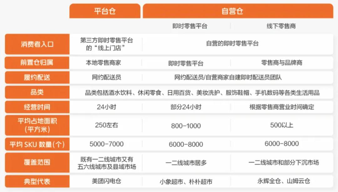从经营主体来看,前置仓可分为平台仓和自营仓。平台仓是指,前置仓商家在第三方即时零售平台上开设线上门店,自主管理线下仓,典型代表是美团闪电仓商家。自营仓则是,前置仓商家自营即时零售平台和线下仓,可具体细分为两大类:一是以小象超市、京东小时达、朴朴超市为代表的即时零售平台资源前置仓模式,二是以山姆云仓、永辉全仓为代表的拥有线下仓库的零售商自建线上平台模式。