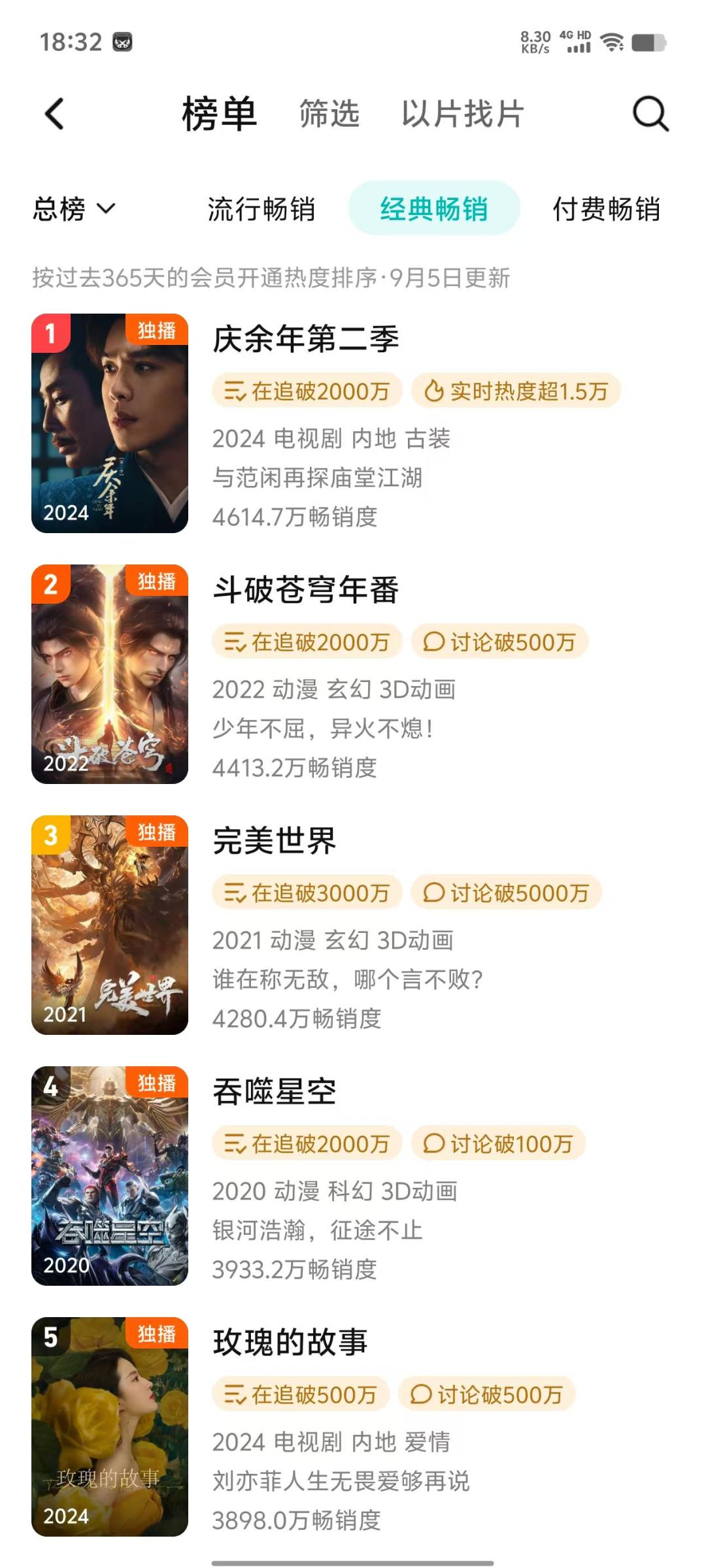 小娱再用腾讯视频的官方【经典畅销榜(即365天内会员开通热度排序)】举例,前五名均为男性向明显的项目,甚至是动漫类圈层明显的项目,当然坏处就是男性网络社交能力和意愿偏弱,难以产生破圈影响力。