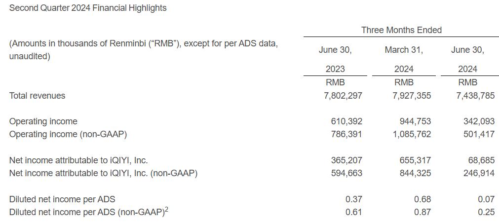 8月22日,爱奇艺发布了2024年第二季度财报;营收74亿元,同比下降5%。