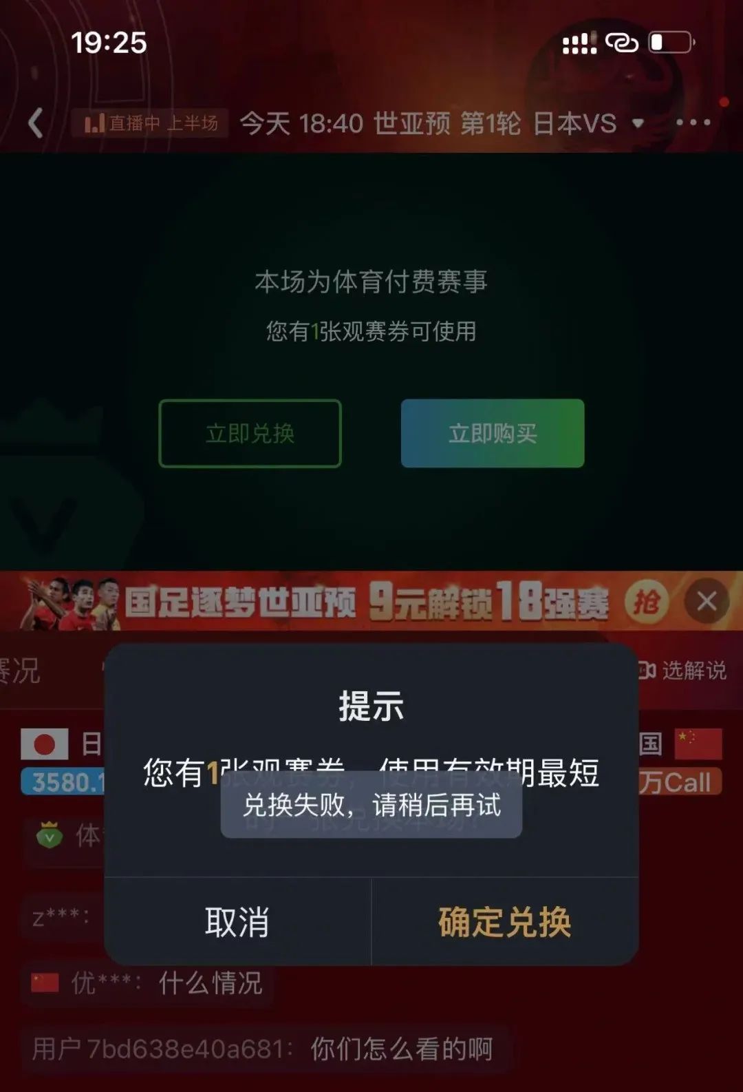 还没完,比赛开始后,不少球迷发现自己花了9块钱,依然没法看比赛,App显示观赛券兑换失败。