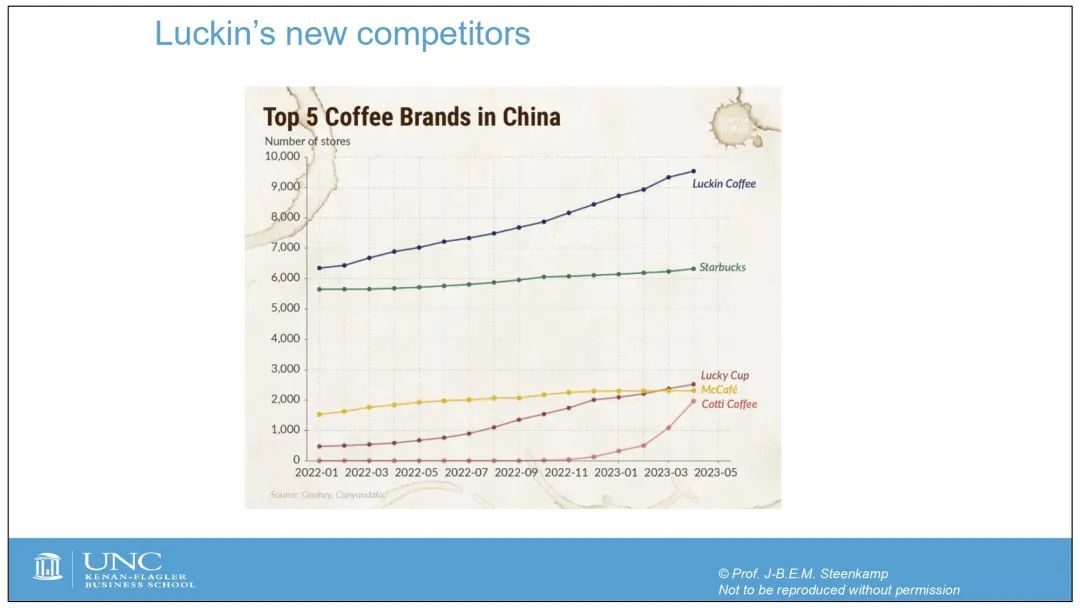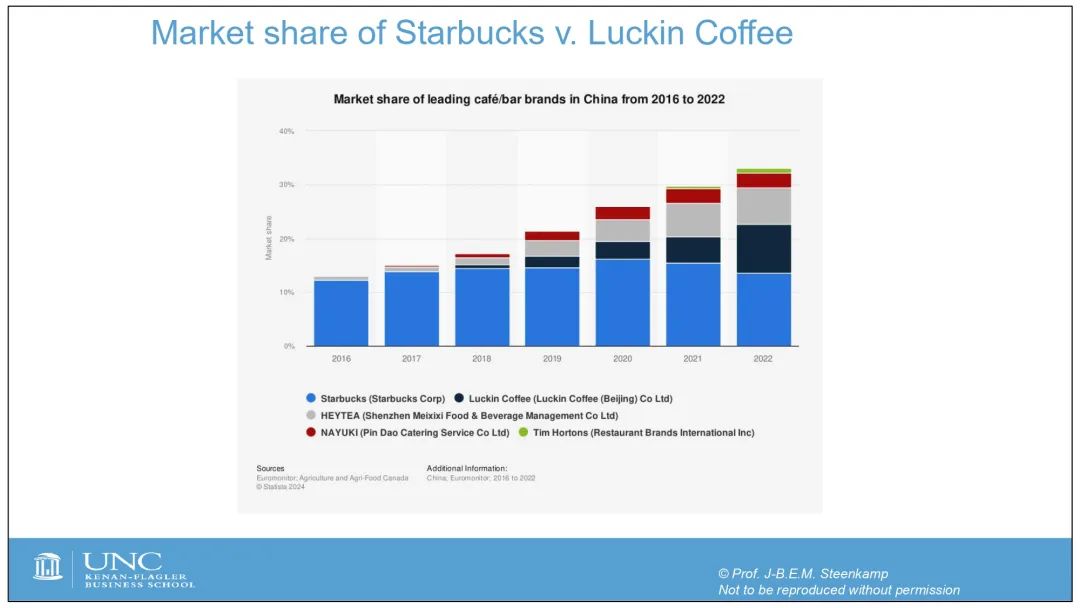 以瑞幸咖啡为例,从2018年到2022年,其市场份额显著增长。有趣的是,喜茶(柱状图中的灰色部分)显示出了快速增长。这引发了我对这一现象的研究,因为过去中国更倾向于茶文化而非咖啡。中国人对咖啡的喜好是后来才形成的,这种发展使得像星巴克这样的咖啡连锁店蓬勃发展,但茶饮连锁店却不多见,这与我们最初的认知不符。