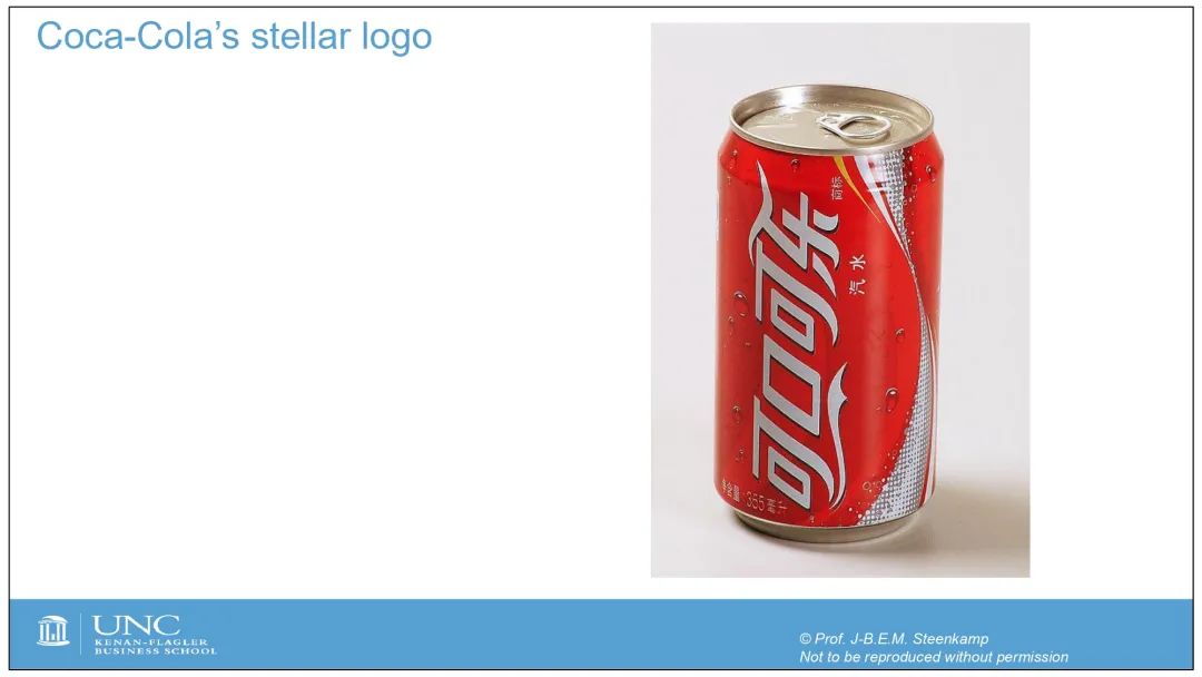 第四,品牌传承。可口可乐在中国市场,也是一个非常好的例子,可口可乐被翻译成可口可乐,本身就是一个非常合理的音译,而我把中国的包装放到美国时,我的美国学生都能够认得出来这就是可口可乐,因为它的视觉、颜色、飘的彩带,都是视觉元素的一部分。他们把这种彩带的设计作为一种艺术加入到了Logo的使用方式上面,而让它成为了在那些没有办法识别这四个中文字体的国家和人群当中,也能够辨认出这就是可口可乐。