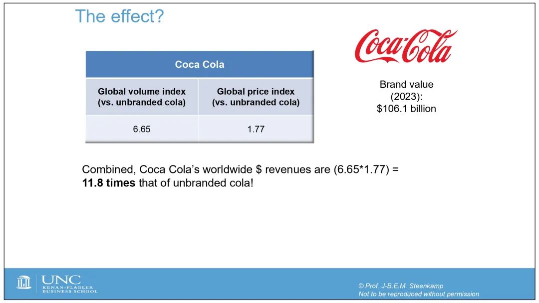 可以看到,可口可乐在全球的销售收入是所有的无品牌可乐收入的近12倍。有品牌和无品牌的可乐也许在口感上,大家不一定能够分辨清晰,但是可口可乐的品牌价值接近一千亿美元,证明品牌的价值深深地根植在消费者心智之中的。