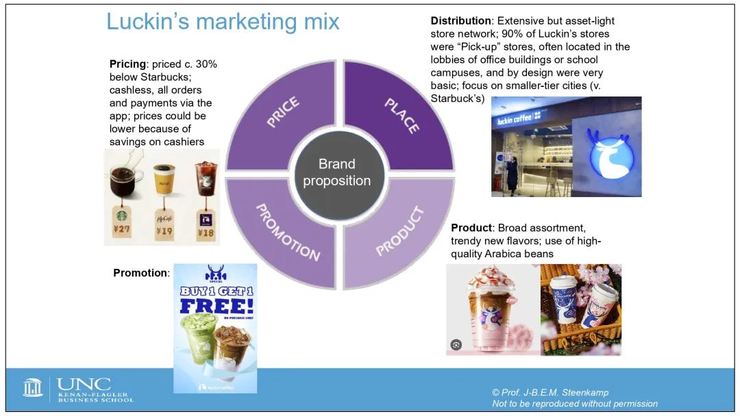 以瑞幸咖啡的营销策略组合为例子,瑞幸咖啡以比星巴克便宜30%的定价策略为主,同时推广无现金支付和APP点单以降低人力成本。他们的轻资产门店网络,网上订购,门店取货,门店面积可以更小。