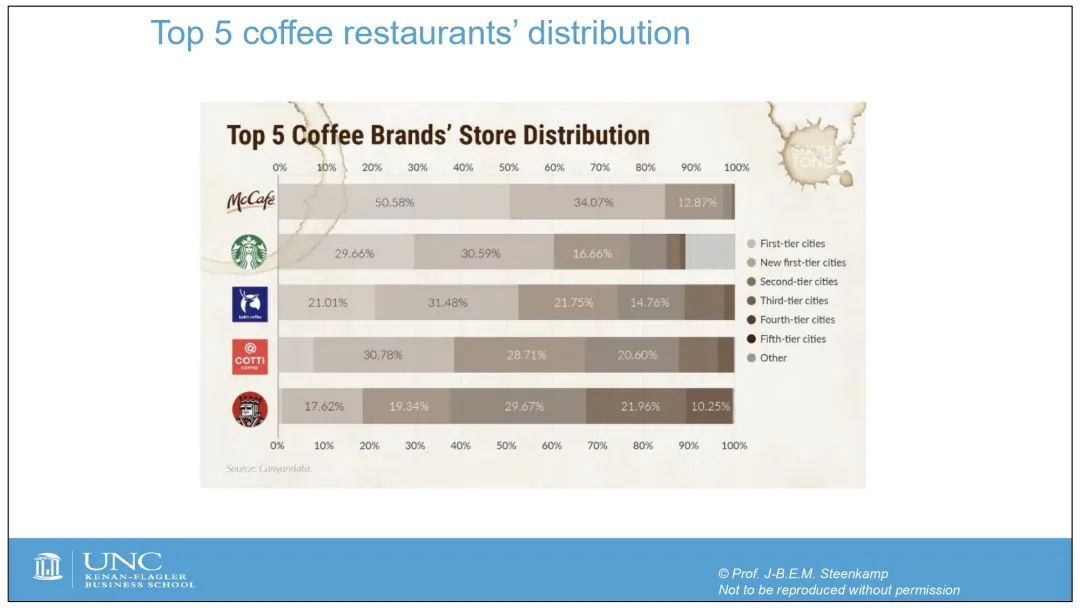 同时,瑞幸咖啡更专注于低线城市,并推出更多时尚潮流的新口味。与此不同的是,星巴克主要集中在一线城市,而麦当劳的麦咖啡50%在一线城市,85%在一二线城市。库迪咖啡和蜜雪冰城等品牌则更注重下沉市场。这几家不同的咖啡连锁品牌在中国市场扩张时采取了不同的策略。实际上,中国的本土品牌在运营时有着更聪明的选择,尤其是相较于美国的麦咖啡和星巴克这两个品牌。