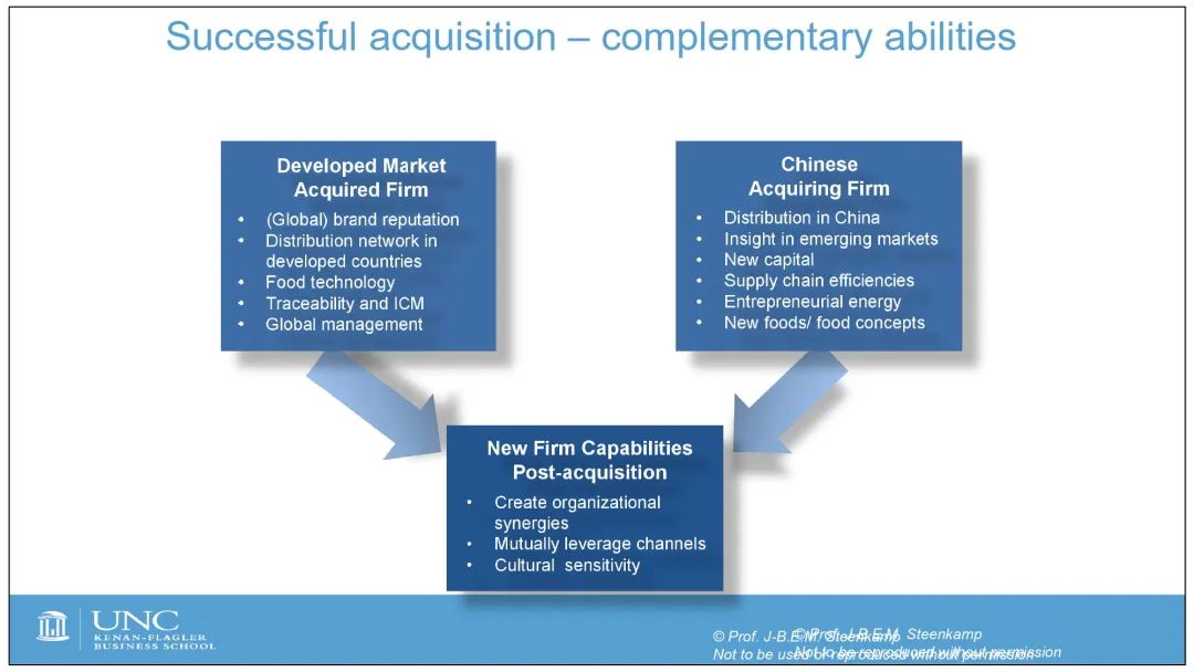 第一,目标市场是否具备良好的品牌声誉和全球知名度。第二,目标市场是否拥有成熟的分销网络,如超市及其他零售网点。第三,是否具备与食品相关的技术。例如,中国企业可以考虑收购荷兰企业,因为荷兰在食品科技领域全球领先。以色列公司在食品科技方面也非常知名。第四,供应链管理和可追溯性。食品行业中,尤其在欧盟国家,可追溯性至关重要。英国和荷兰的零售商以及沃尔玛等零售商也高度重视这一点。第五,全球管理能力。