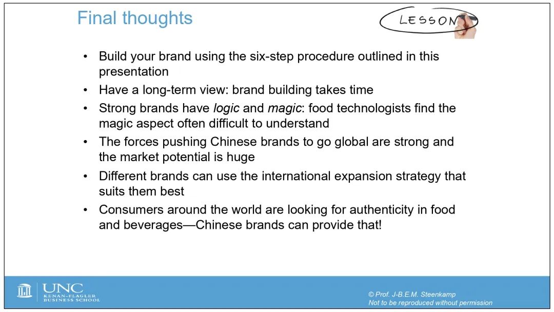 在中国品牌走向国际化的过程中,需要更多地融入中国文化。消费者在全球市场中对食品与饮料的真实性有着更高的追求,包括口味和原料的真实性。我相信中国品牌能够像西方市场一样满足这些需求,并提供真实口味的产品。我今天的演讲中无法详细讨论这些内容,但我已经出版了两本相关书籍,并翻译成了中文,欢迎大家了解。