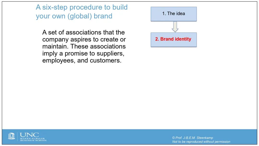 第二个步骤,了解品牌身份(Brand Identity)。初始的想法创意只是第一步,第二步当你要去建立一个品牌时,要非常仔细小心地去确认好品牌身份。品牌身份是指这个公司希望创建或者维持的一系列的关联,这些关联意味着公司对于供应商、员工、客户的承诺是非常重要的。