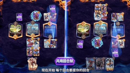 之前的很多卡牌游戏是轮流回合制,也就是你一回合我一回合依次出牌。而在共用回合制中,双方是在同一个回合出牌,回合结束后同时开牌。