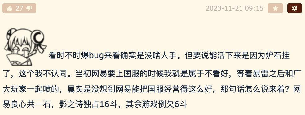 坊间如此形容:网易良心共一石,影之诗独占 16 斗,其他网易游戏倒欠影之诗 6 斗。