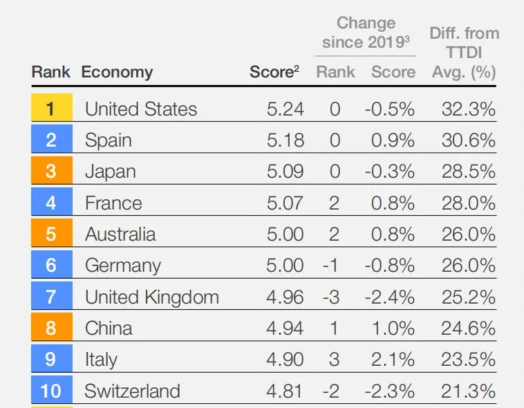 世界经济论坛(WEF)每两年会发布一次全球旅游经济实力排行榜,在最新一期中,美国凭借着丰富的国家公园、顶尖大学和大都市区的存在,获得了综合排名第一。而中国,却仅仅位列第八。