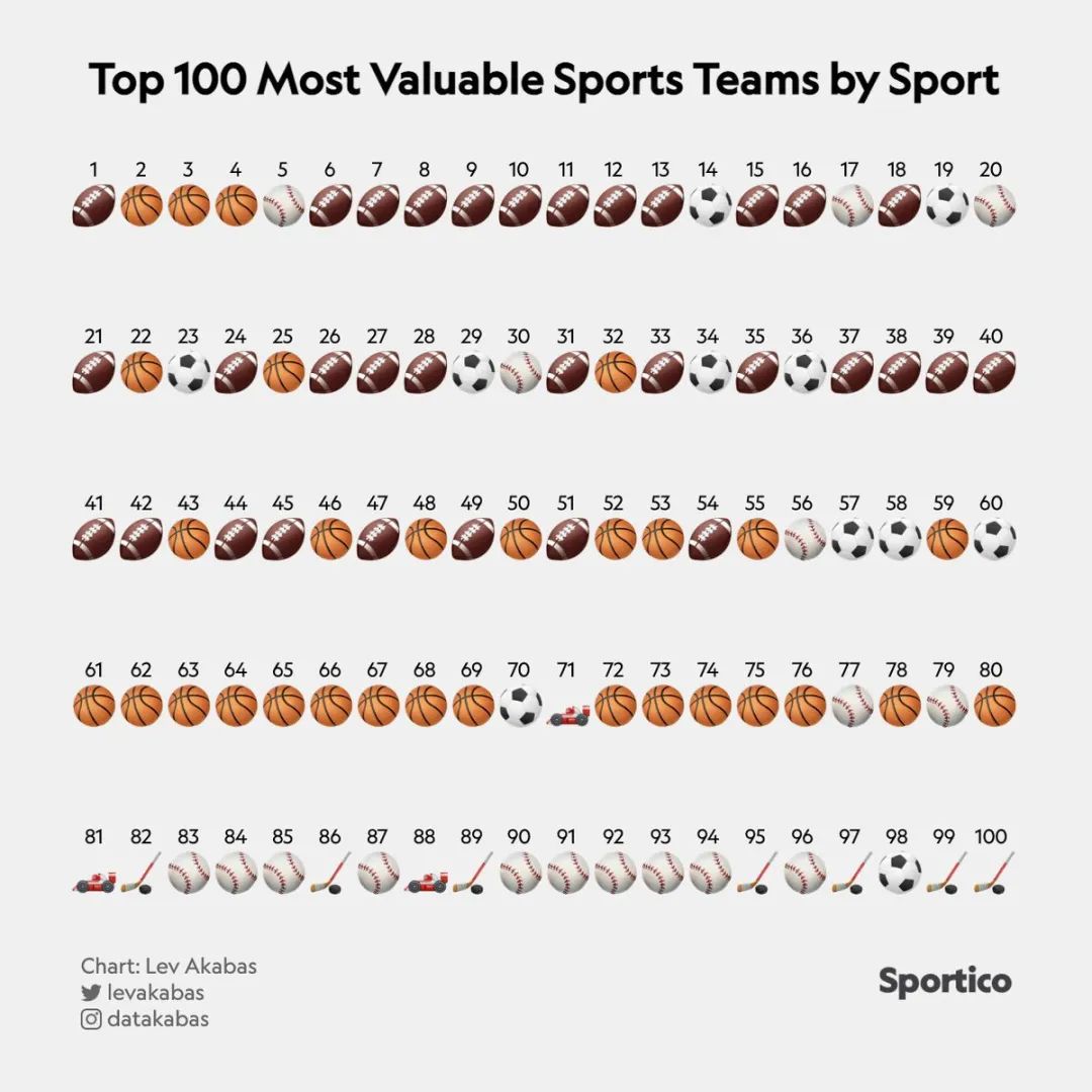 2023年全球最具价值职业体育俱乐部TOP100中,北美四大体育联盟占据了86个位置,其中NFL和NBA更是实现了全部球队上榜,图源:Sportico