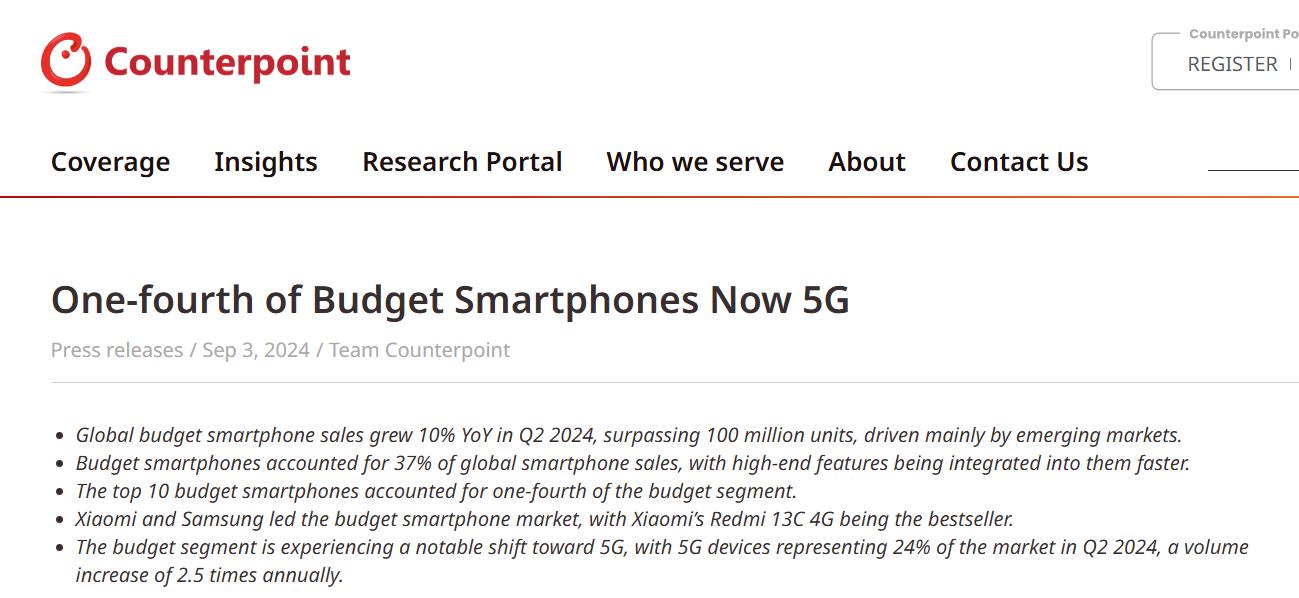近日,市场调查机构Counterpoint Research发布博文,报告称受新兴市场推动,2024年第2季度全球经济型智能手机销量突破1亿部,同比增长超10%,占全球智能手机销量的37%;作为对比,同期全球智能手机大盘同比增长6%,均达到了自2021年第2季度以来的最高同比增长。