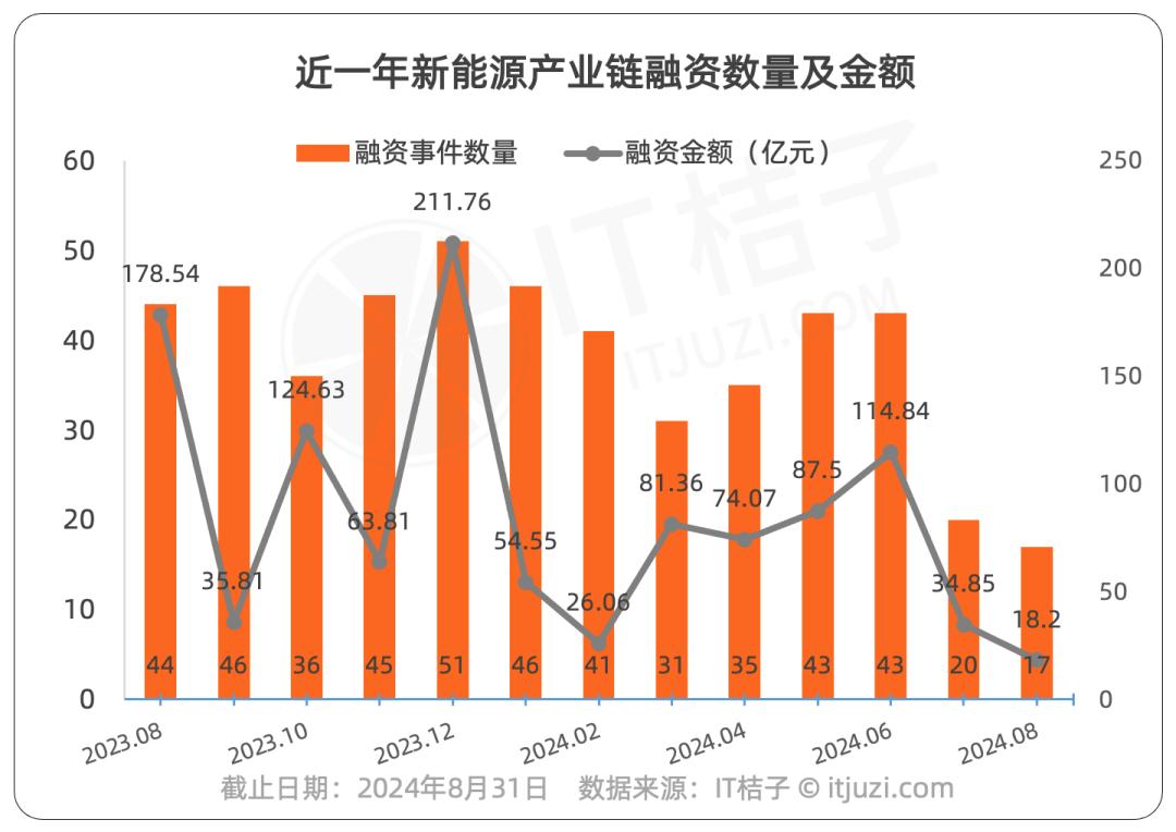 进入 2024 年以来,融资金额大幅度下跌,在 2024 年 6 月(114.84 亿元)经历了短暂的复苏之后,2024 年 8 月新能源产业链的融资金额仅为 18.2 亿元人民币,为近一年来新低。