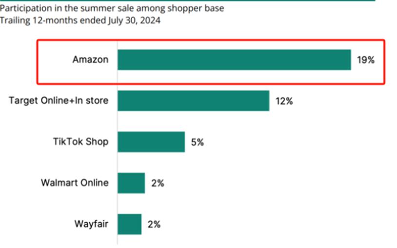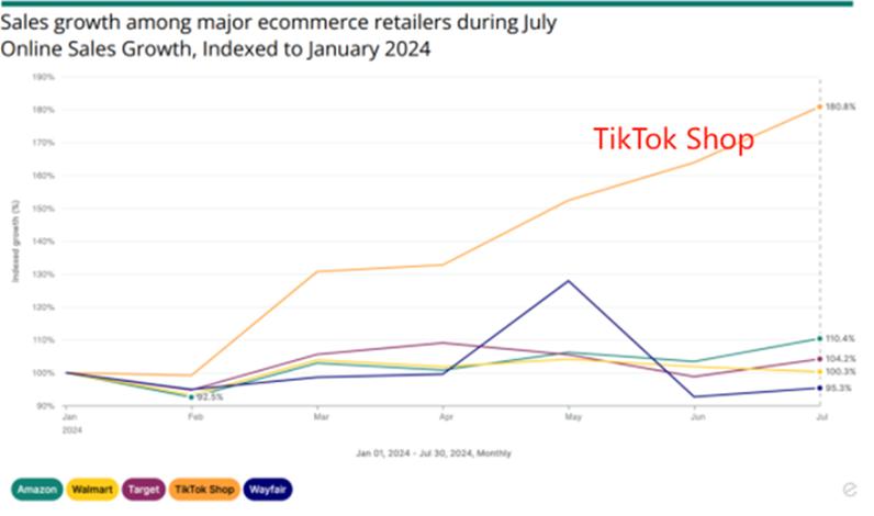 同样由Earnest Analytics针对亚马逊、沃尔玛与TikTok Shop等五大电商平台在美国市场于今年7月(即年中大促)的调查报告来看,亚马逊以83.6%的市场份额遥遥领先,比6月份上升1.6个百分点,而TikTok Shop仅占1.5%。