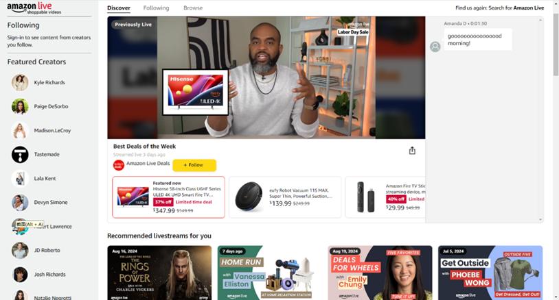 2016年3月,亚马逊推出了专注于时尚和美妆的Style Code Live直播秀,却像是把电视购物搬到网上。仅仅15个月后,这档直播秀就被停播。2019年,再次推出直播平台Amazon Live,提供来自亚马逊自制和品牌商家的实时流媒体视频节目。Amazon Live仍在运营,但既不活跃,转化率也难言乐观。骑鲸出海注意到,官方直播间最近一次直播也停留在“3天前”,而且横版的直播界面并不适合移动端的观看习惯。