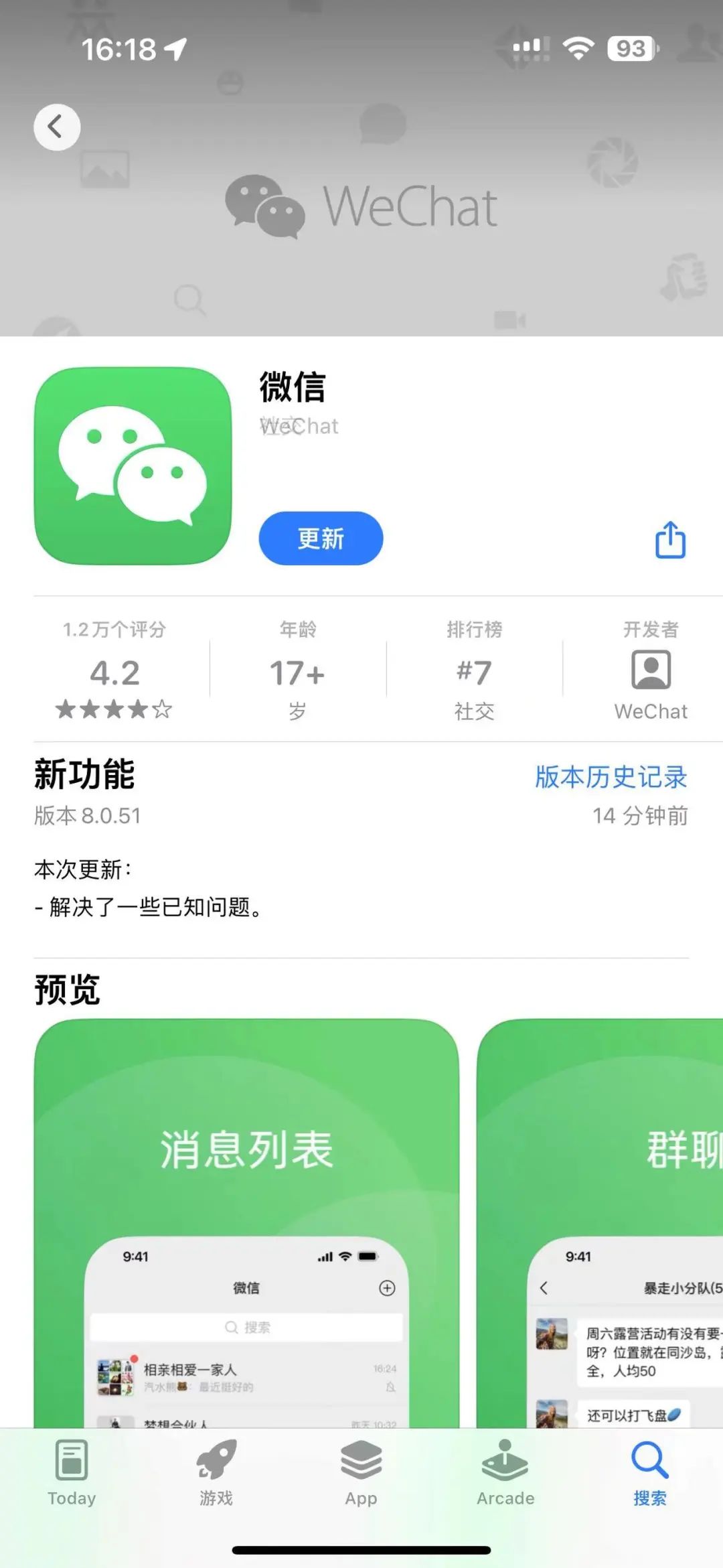 微信新版本已在苹果商店正常更新。图片来源:苹果商店截图