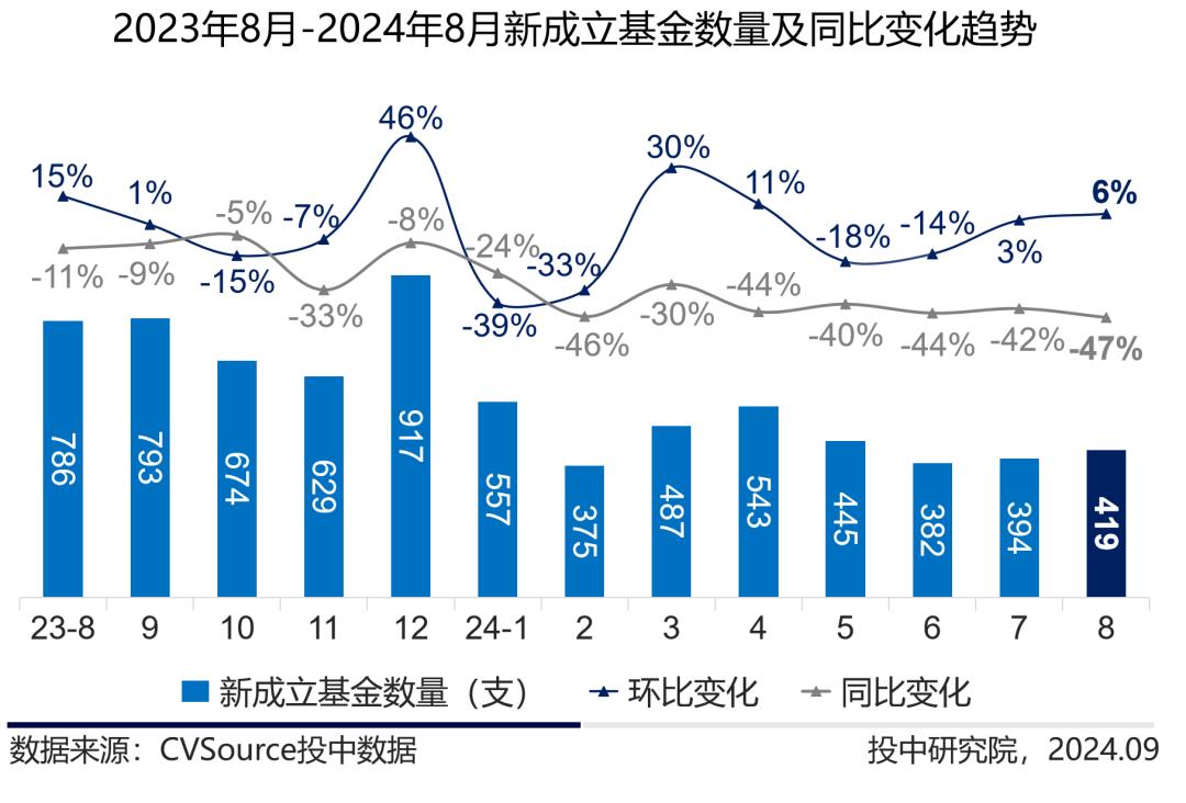 2024年8月,中国VC/PE市场新成立基金数量共计419支,同比下降47%,环比上升6%。新设基金数量缓慢回温,但与去年同期相比,市场前景并不明朗。