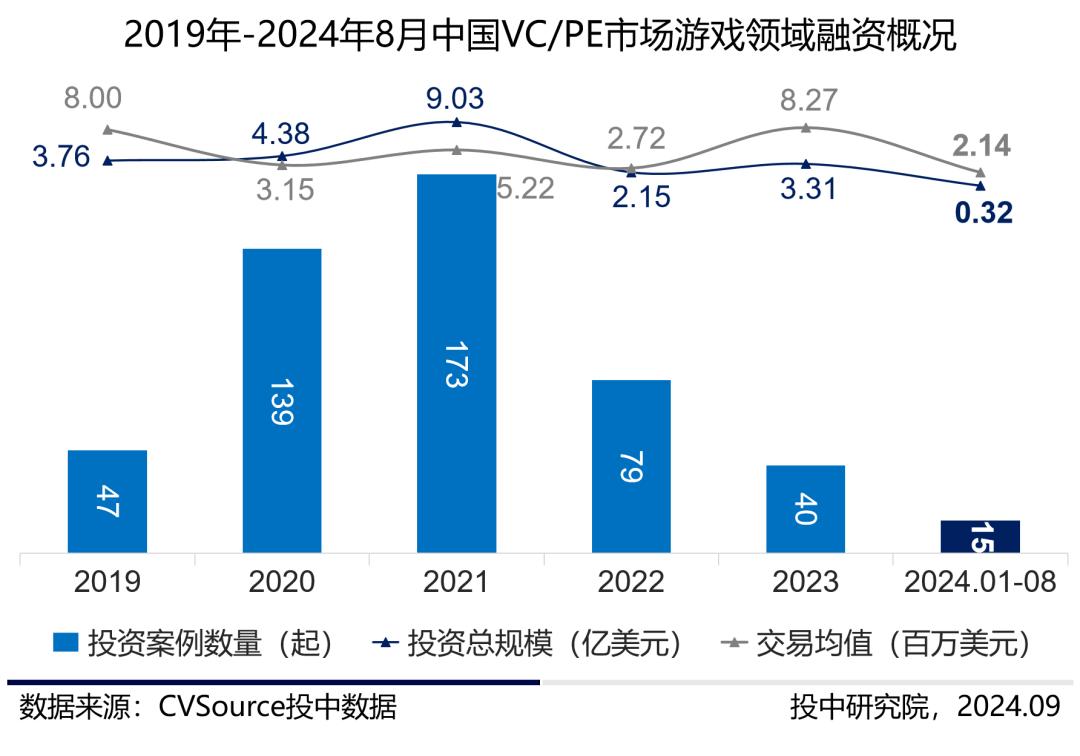 2024年8月20日,备受期待的国产3A游戏《黑神话:悟空》上线,据机构统计,《黑神话:悟空》两周内卖出1800万套,屡次登顶Steam全球销量榜。黑神话的火爆程度与游戏领域投资市场的表现对比鲜明,游戏领域在投资市场上的表现在2021年达到巅峰,之后呈现逐年降温的趋势,资方对游戏赛道出手谨慎。英雄体育获18亿元C轮投资为近两年融资案例规模最大值,同时创下电竞行业有史以来现金投资的新纪录。