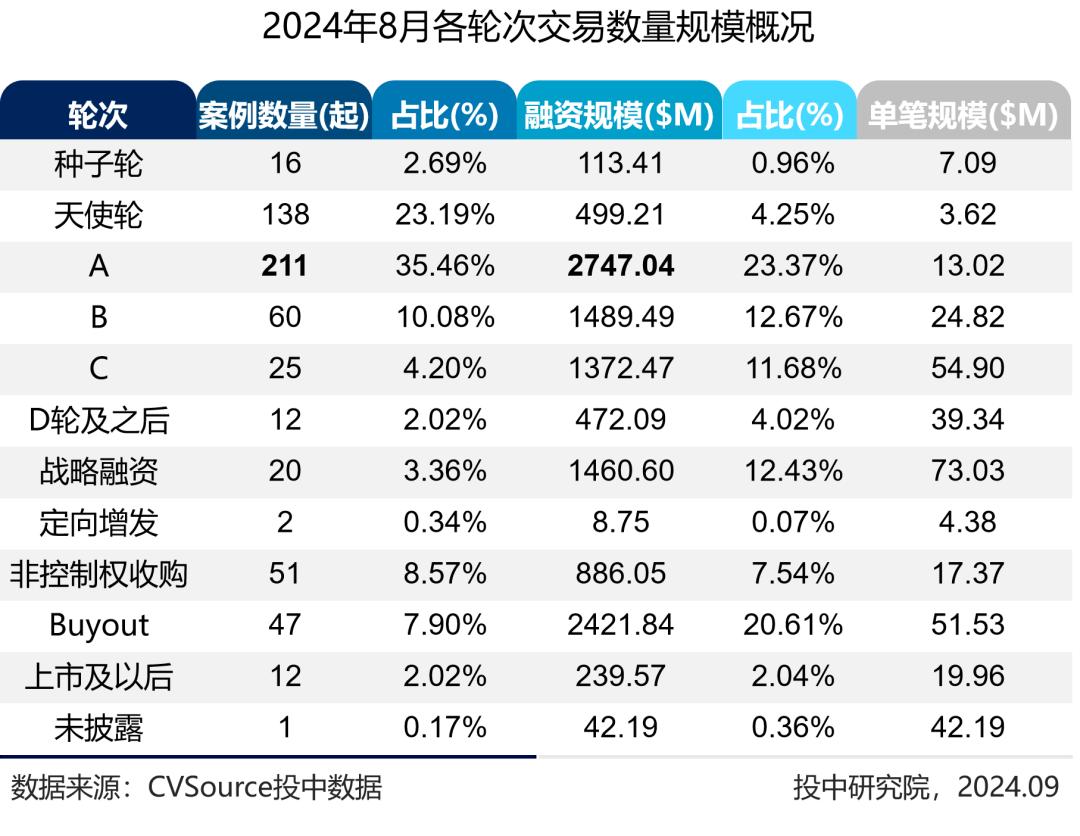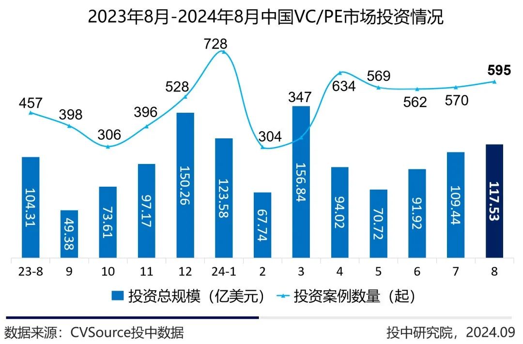2024年8月,投资案例数量595起,环比上涨4.39%,同比上涨30.20%;投资规模117.53亿美元,环比上升7.39%,同比上涨12.67%。近三个月投资案例持续增长,投资市场稍稍回暖。
