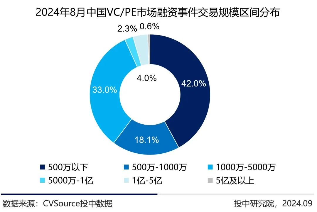 2024年8月,中国VC/PE市场中A轮融资数量保持领先,涉及交易211起,市场占比超三成,天使轮融资数量138起,市场占比超两成。整体来看,VC阶段交易数量占比近八成。
