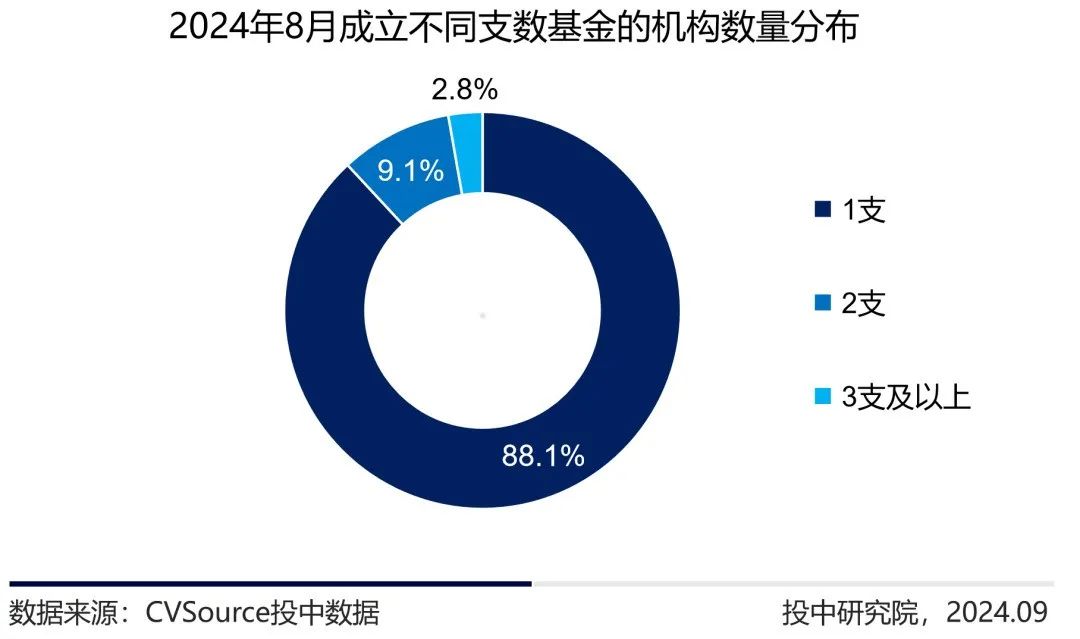 2024年8月,共有361家机构参与设立基金,环比机构数量有所增加,88.1%的机构成立1支基金,9.1%的机构完成2支基金新设,2.8%的机构完成3支及以上基金新设。环比上期表现,机构活跃度有所提高。本期新鼎资本、玺德投资和君实正和等机构募资较活跃,新设基金均在3支及以上。