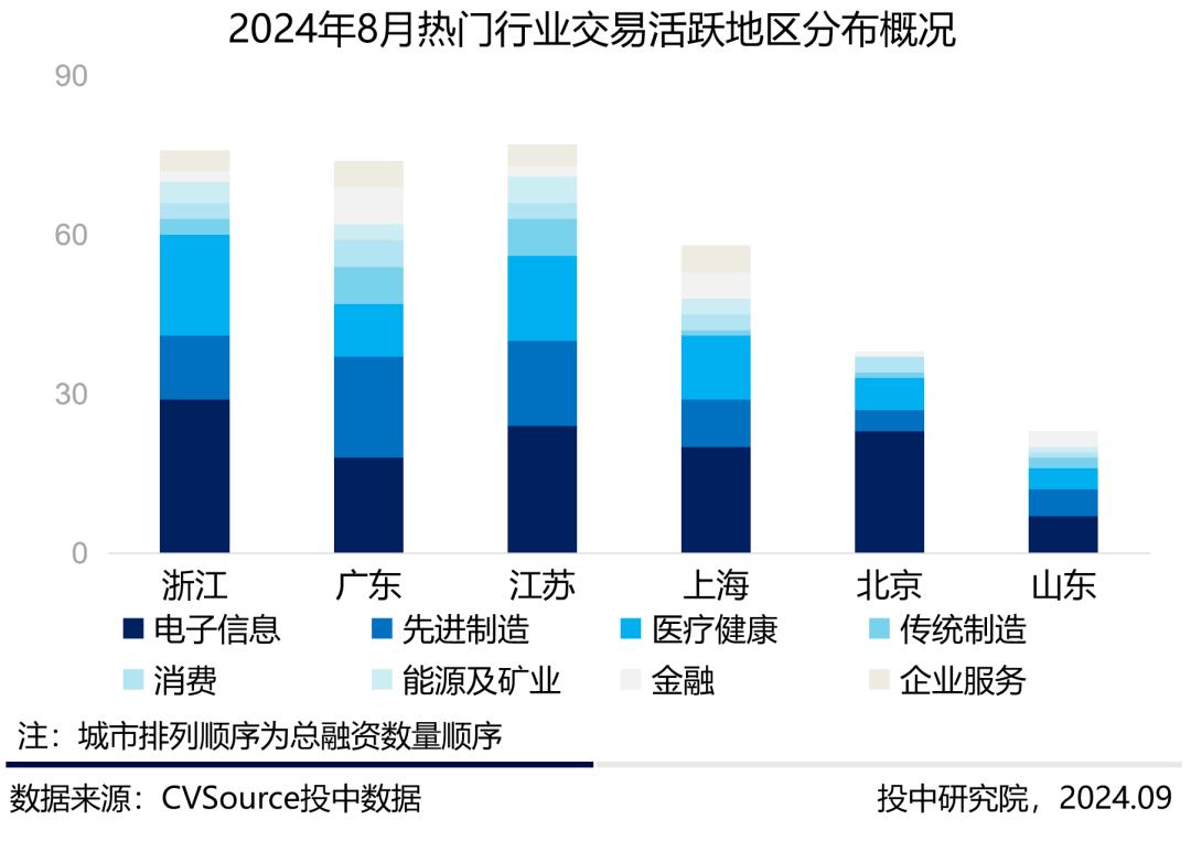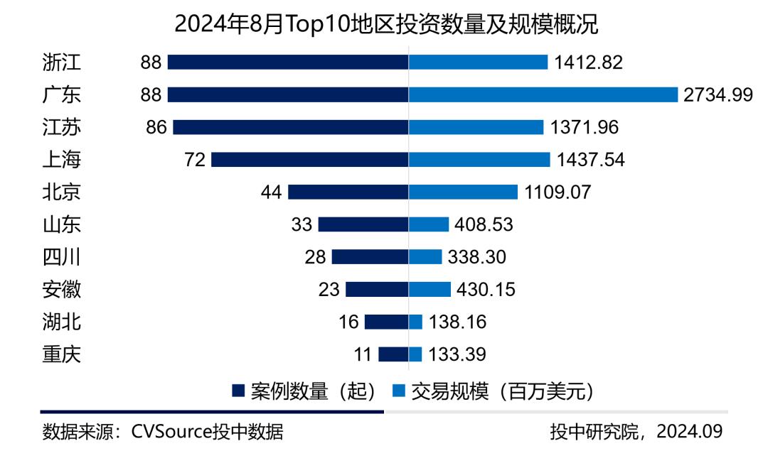 2024年8月,浙江、广东、江苏为热门城市Top3,浙江与广东案例数量持平,江苏以两支之差紧随其后;上海、广东、浙江等地区交易规模领先,广东交易规模达27.35亿美元,单笔规模均值达到31.08百万美元,为本期交易规模最大以及交易均值最高的城市。