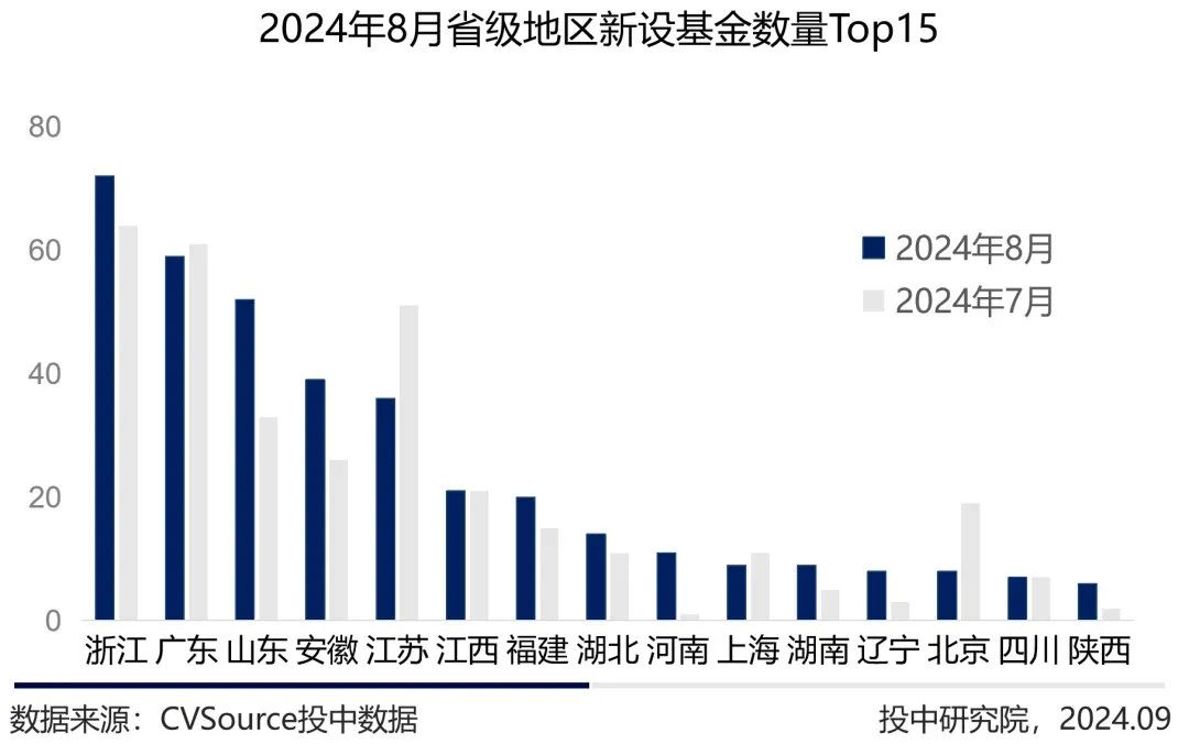 2024年8月,共计27个省市区参与新设基金,从省级地区分布来看,浙江、广东、山东新成立基金数量为全国Top3,对应数量依次为72支、59支、52支。环比上月,除江苏、上海和北京外,其他省份本期新设基金表现更佳。