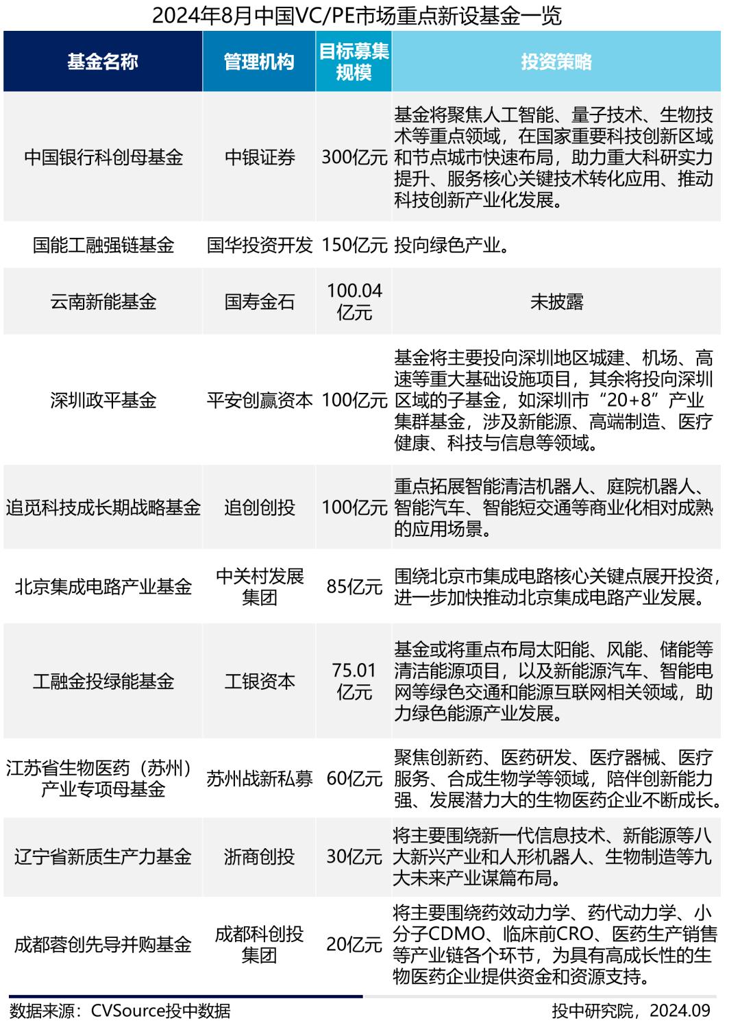 2024年8月,中国银行科创母基金成功落地,是国有大型商业银行首个成功推进设立的科创母基金,为本期规模之最。从投资领域来看,新能源领域备受青睐。