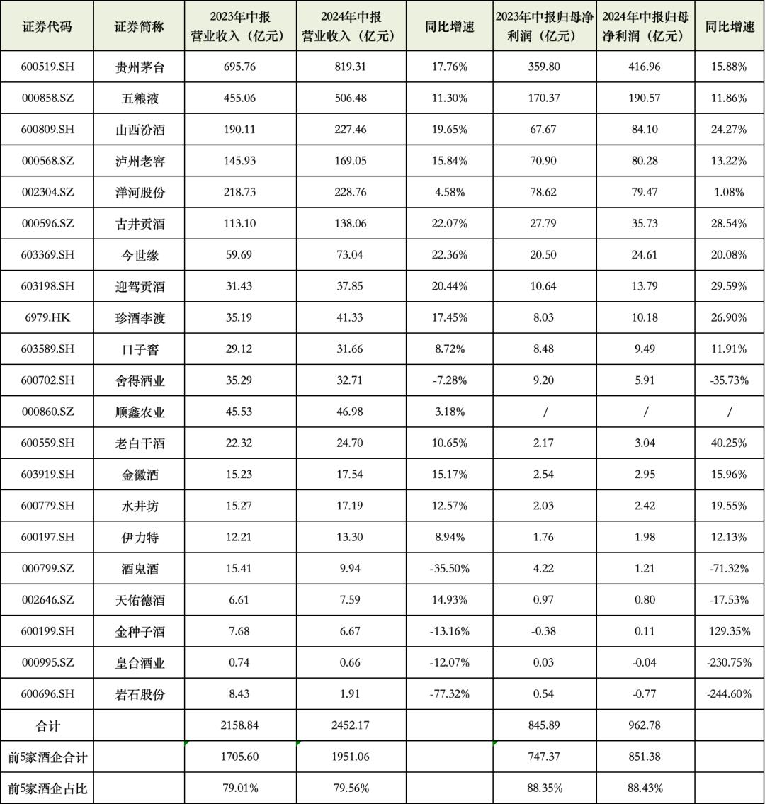 整体来看,白酒行业的整体复苏未达预期,但不少上市酒企表现出较强发展韧性。其中,前5家酒企贡献近九成营收,净利润规模优势也在持续扩大。